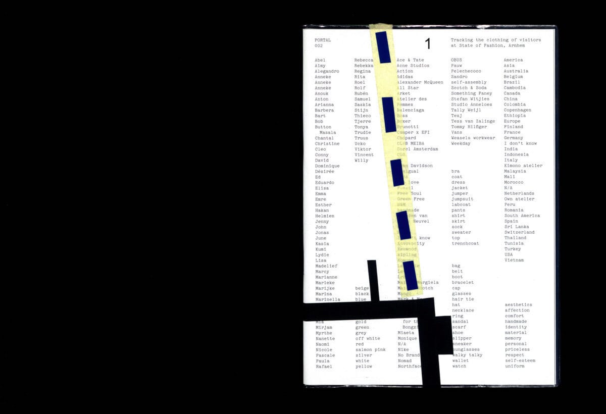 For PORTAL 002 Elisa van Joolen worked with visitors of State of Fashion in Arnhem to research the economic, social and emotional value of clothing. The collected data is visualized and brought together in a reader designed by Beau Bertens.