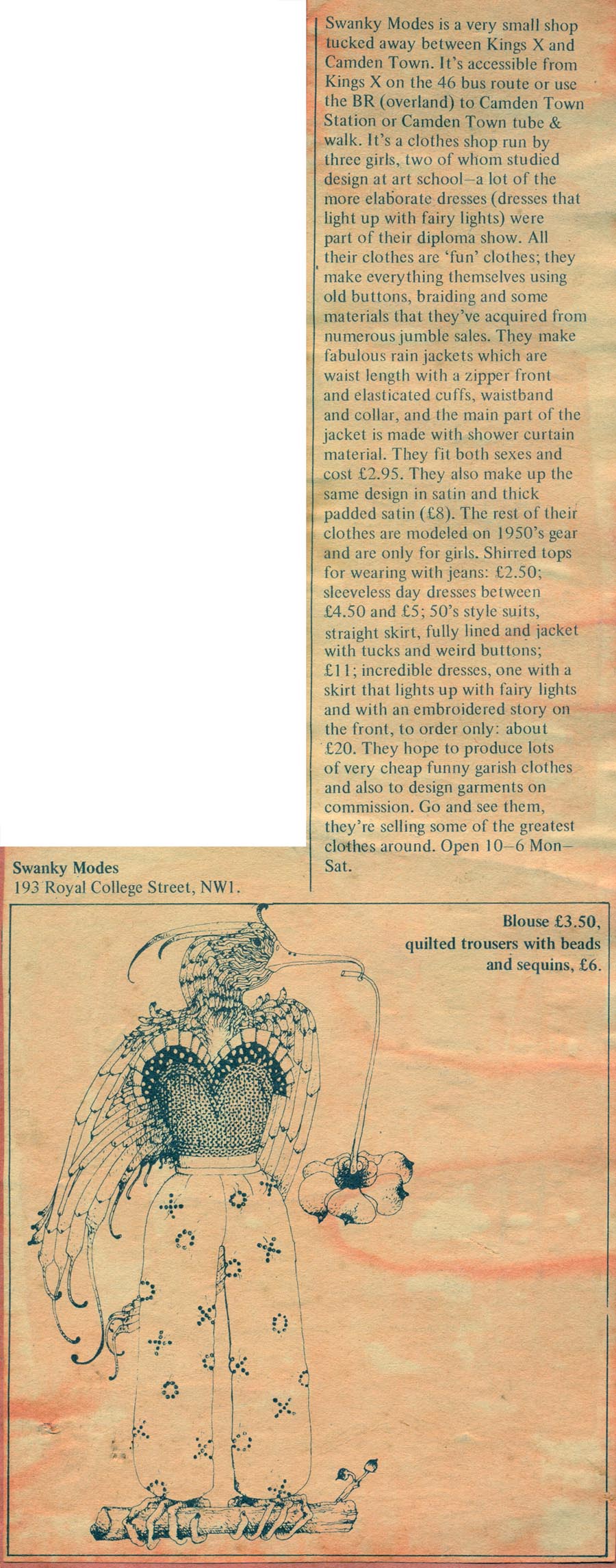They were joined a year later by RCA graduate Judy Dewsbery. Swanky Modes moved to 106 Camden Road in 1974 and continued with small runs of retail designs and collections of quirky accessories.