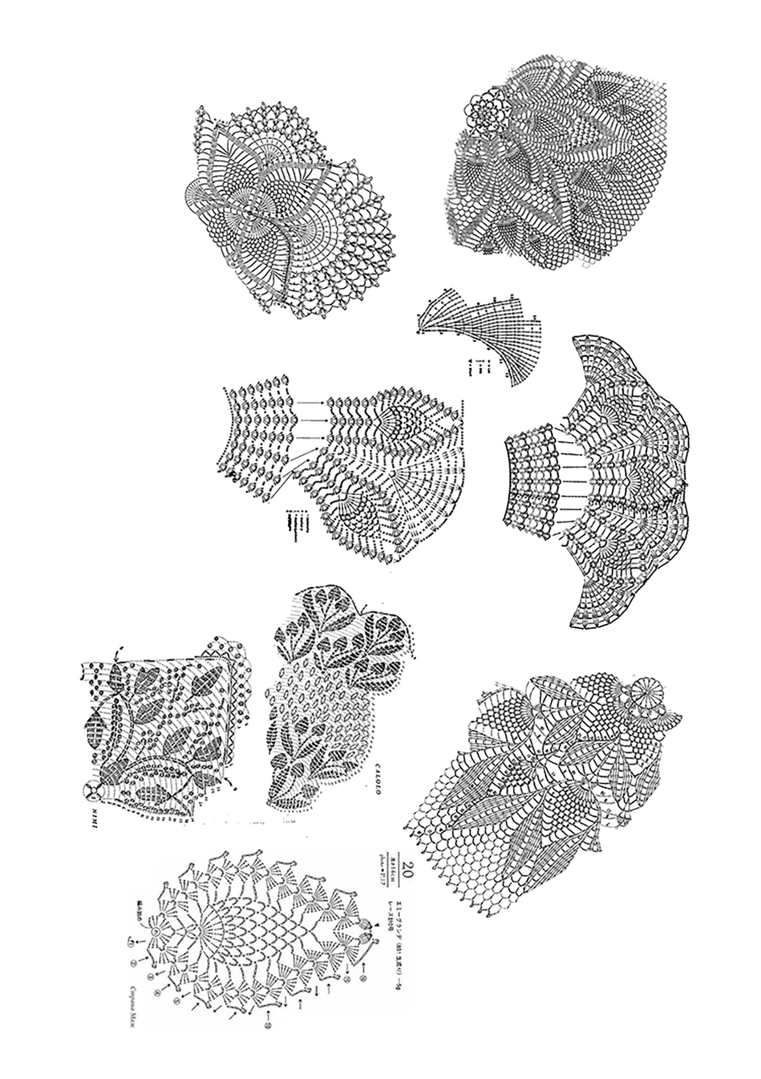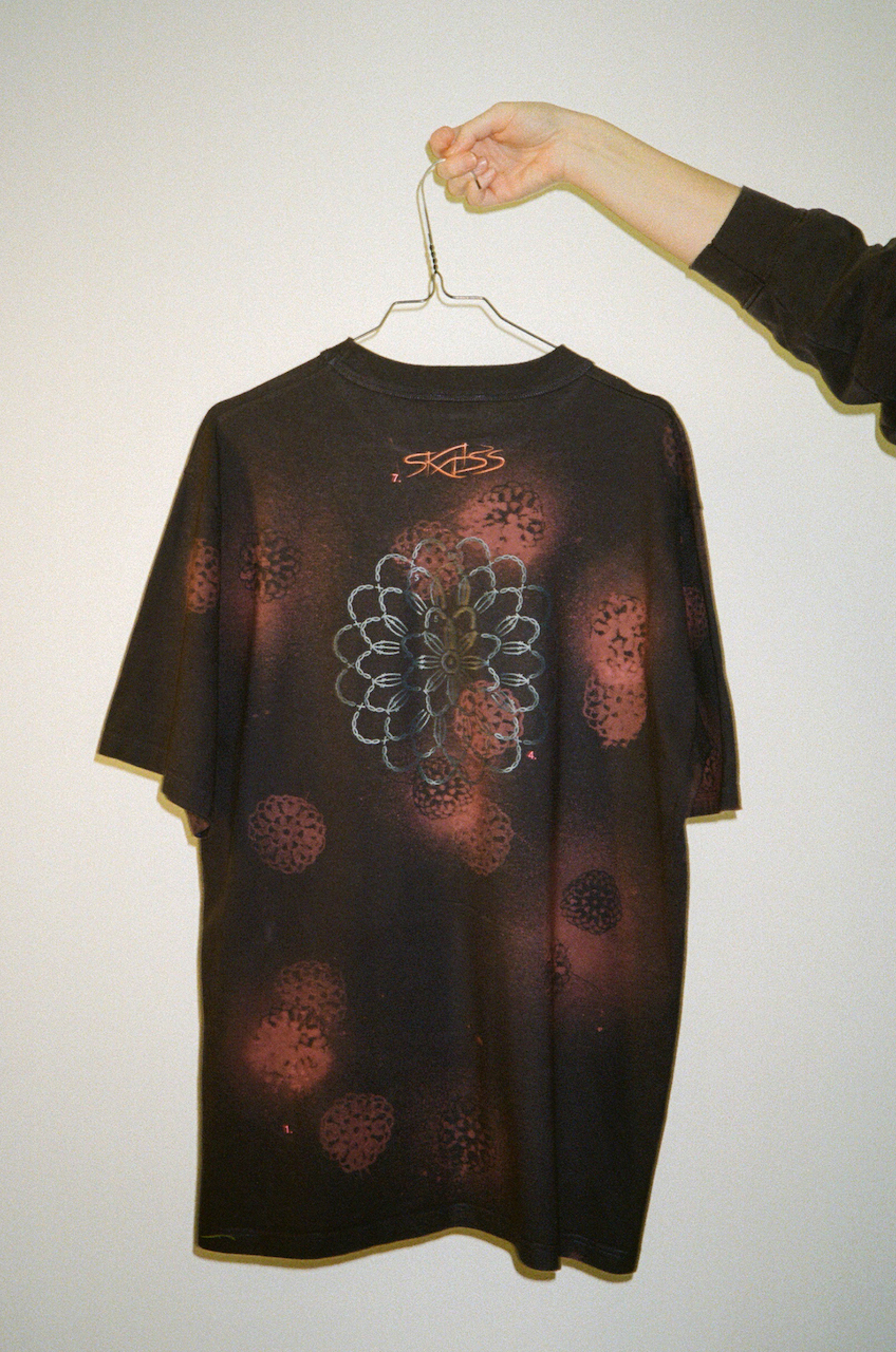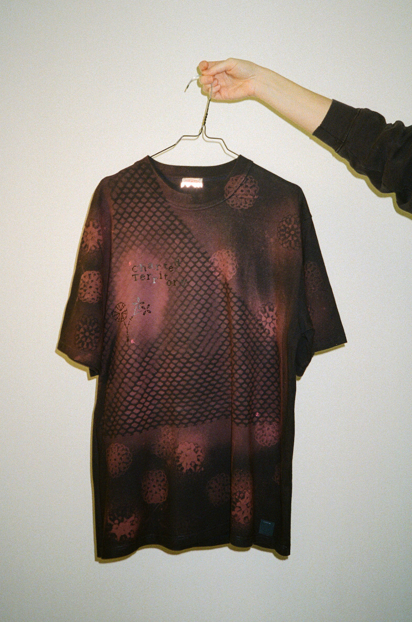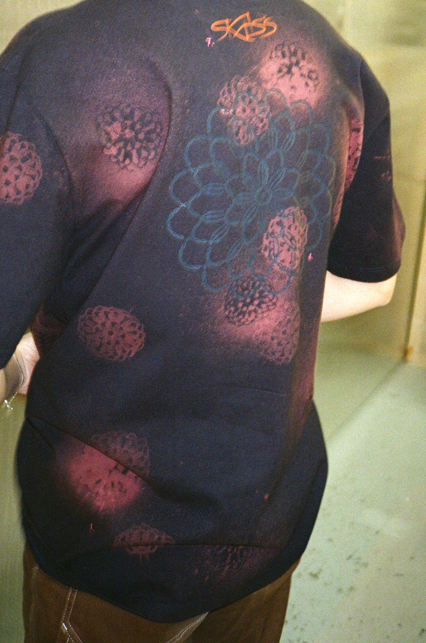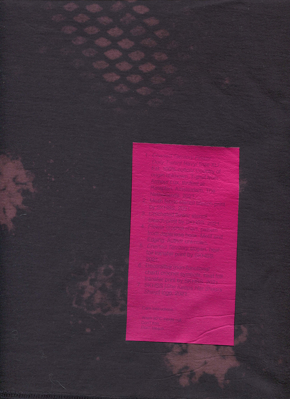 The work of SKHSS takes the shape of a collection of hand-crafted garments made from thrifted t-shirts and sweatshirts adapted with additional materials and techniques like yarn, reflective heat foil, dyes and bleach. The prints engage with the multiple layers of information retrieved from crochet charts, which both instruct how to crochet and at the same time describe the crochet visually. These charts are intricately coded diagrams that use a universal language of symbols. Through reading (crochet) code, recreating and creating new code, SKHSS traces and builds upon this historic information. To imbue the garment with its history and immortalize all the hands at play, footnotes are placed on the inside of the garments, tracing the origin of the elements on the garment.