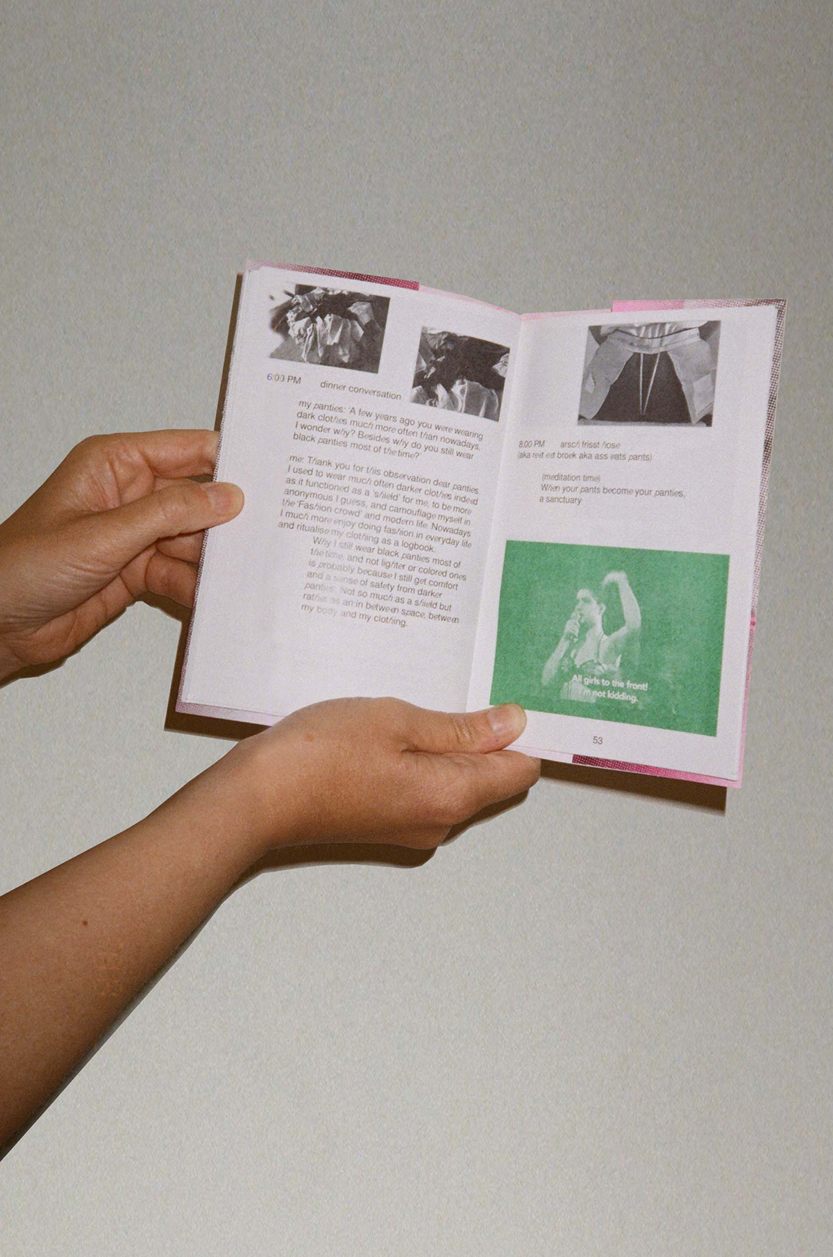 The first issue of the zine, A Collective Manifesto, includes ten women's stories of scrutinising panties, exposing how social constructs—self-objectification, gender regulations, conventional chastity, taboos, slut-shaming, body-shaming, etc.— hinder women’s sense of safety and feeling at home in their bodies.